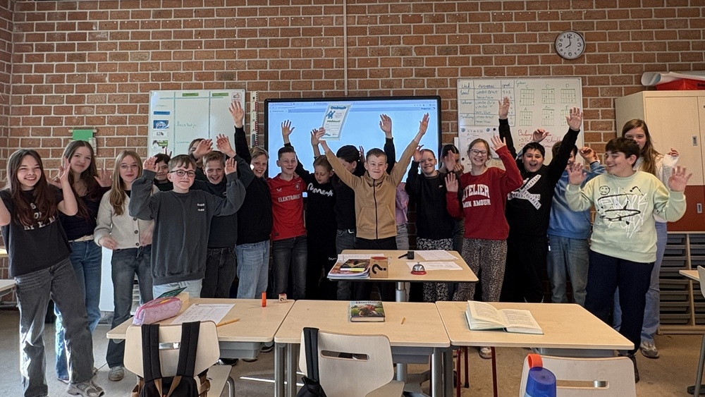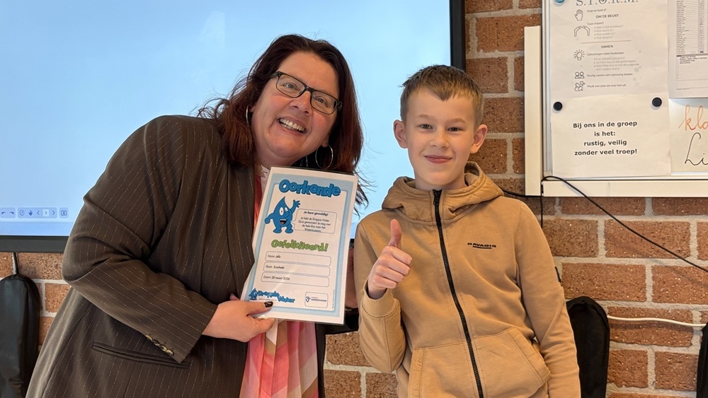 Omdat basisschool Helmerwijs in ons werkgebied ligt, reikten wij de prijs persoonlijk uit. Dat gebeurde op 30 maart in Enschede, waar Jelle werd verrast in zijn eigen klas. Onder applaus van zijn klasgenoten nam hij de prijs in ontvangst. “Het is mooi om te zien hoe enthousiast kinderen zijn,” vertelt Ellen Hemmers, dagelijks bestuurslid en portefeuillehouder educatie. “Op deze manier ontdekken zij op een leuke manier wat wij doen als waterschap.”