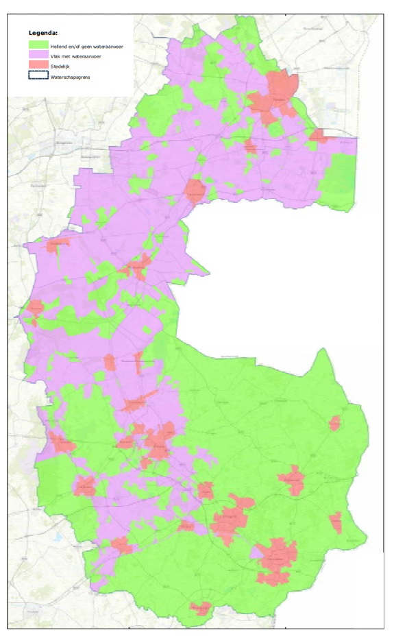 We maken bij de aanpak grofweg onderscheid in drie gebieden: overwegend hellende gebieden zonder wateraanvoer, overwegend vlakke gebieden mét wateraanvoer en stedelijke gebieden. In het kaartje hiernaast is dat met kleuren aangegeven. In de overwegend vlakke gebieden met wateraanvoer zijn andere maatregelen (meer) effectief dan in hellende gebieden (bijv. stuwen). In hellende gebieden doen we veel om water vast te houden in droge tijden en om er voor te zorgen dat de benedenstrooms gelegen gebieden niet te veel water ineens te verwerken krijgen. In de overwegend vlakke gebieden optimaliseren we voor de korte termijn ons systeem van wateraanvoer. Maar voor de langere termijn bereiden we ons er op voor dat deze wateraanvoer eindig is. In stedelijke gebieden spelen weer andere problemen, zoals het gebrek aan infiltratiemogelijkheden van hemelwater (regen en sneeuw). In de stedelijke gebieden zoeken we zoveel mogelijk ruimte om water te kunnen bergen en om de kwaliteit ook in droge zomers op peil te kunnen houden.