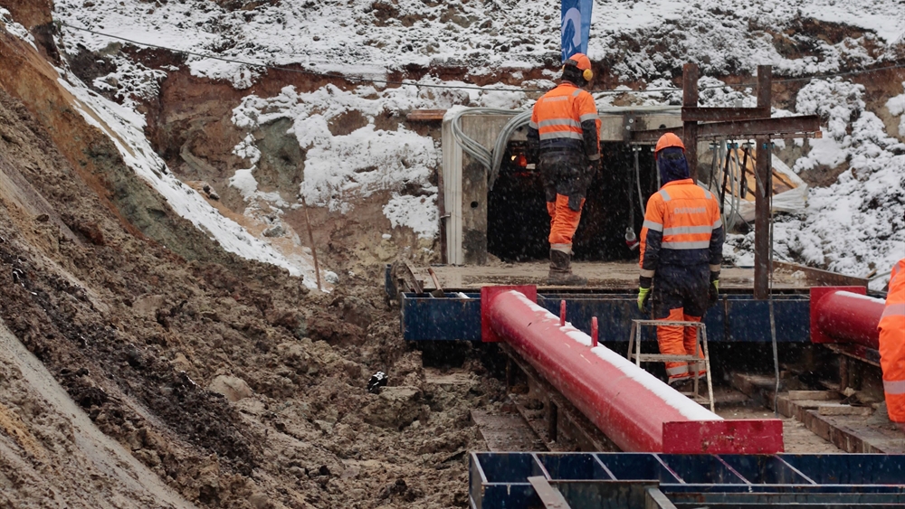 De betonnen buis wordt langzaam onder de weg door geduwd.