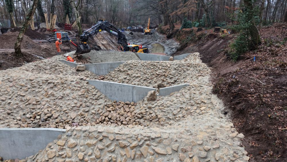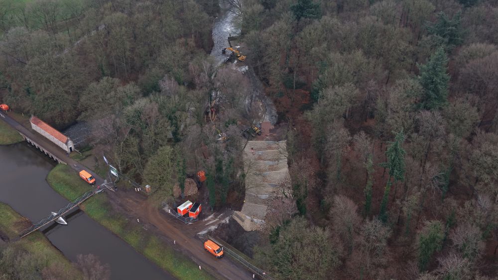 Aanleg van de nieuwe vispassage in de Dinkel naast het Schuivenhuisje.