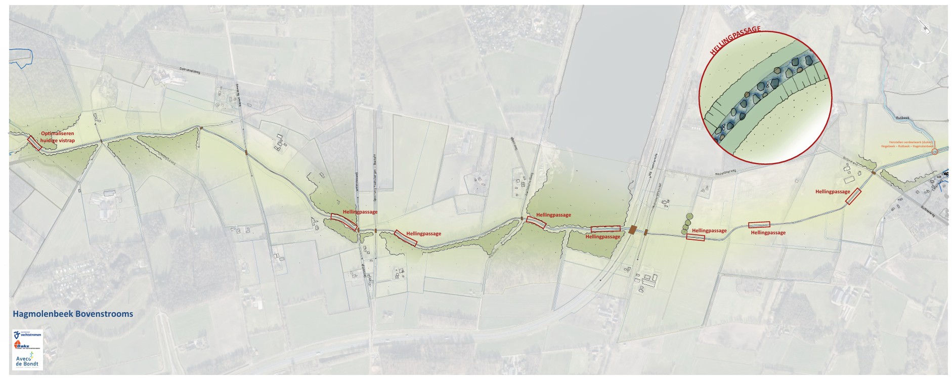 Het ontwerp voor de Hegebeek en Hagmolenbeek is tijdens de inloopavond op 9 maart 2026 aan de bezoekers gepresenteerd. Op onderstaande afbeeldingen is te zien welke werkzaamheden er uitgevoerd worden. Zo worden de stuwen (vis)migreerbaar gemaakt, want stuwen vormen een hindernis voor vissen en andere waterdieren. Daarnaast brengen we meer natuurlijke variatie, schuilplekken en stromingsverschillen aan in de beken, wat de leefomgeving voor vissen en andere waterdieren verbetert.